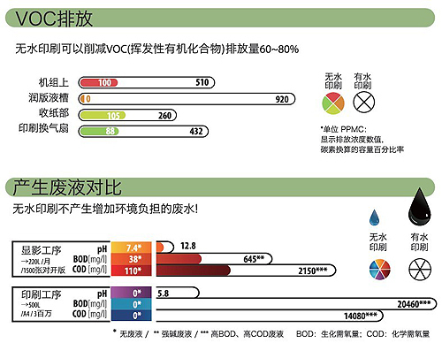 无水印刷,顾名思义,就是与现在的平版有水胶印相比较去掉了水的因素,不需水溶液润版,它是用斥墨的硅橡胶层(硅酮树脂)作为印版的非图文部分,使用特殊油墨来完成印刷的一种平版(平凹版)印刷方式。与传统的有水胶印相比,无水胶印在印刷过程中无须使用润版液,降低了VOC的排放,同时避免了因水造成的水干、水大以及纸张变形引起的套印不准等故障,有效缩短了调机时间、提高了印刷效率。此外,由于无水胶印使用的油墨不会受到润版液的影响,因此生产出的印刷品颜色一致、饱和度高、网点增大率低、精度高。